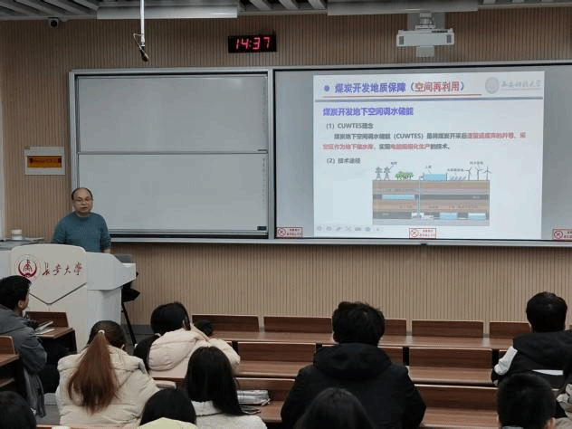 孙强教授综合考虑煤矿地下空间储能的封闭性、恒温性和容量优势以及生物质储能特征,提出了好氧空间利用模式、厌氧空间利用模式、热解空间利用模式3种储能实现路径。煤矿地下空间生物质储能地质保障的科学技术难题包括:储能环境适宜性评价与分析、储能空间合理规划与高效利用、地质体性能演化与全周期运行状态感知、资源化产物精准定向利用与储能空间循环再造。研究为煤矿地下空间高效开发与有机废弃物绿色处理提供了创新性思路,助力煤炭行业实现产能优化与生态效益的双重提升。其分享既贴合学科前沿,又紧扣“碳达峰、碳中和” 国家战略,为同学们带来了兼具专业性与创新性的学术内容。
